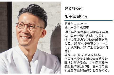 飯田 当院が拠点を置く北海道は地理的に広く、16km以上離れた患者宅への訪問も珍しくありません。車で1時間以上かかる地域もあり、緊急往診が難しい場合には、訪問看護と連携しオンラインで対応することもあります。こうした地域特性を踏まえると、今後はオンライン診療や多職種連携を前提とした在宅医療の運営が不可欠だと感じています。今回の診療報酬改定で、看護師の現地補助に関する新たな評価が示されたことは、非常にありがたいです。