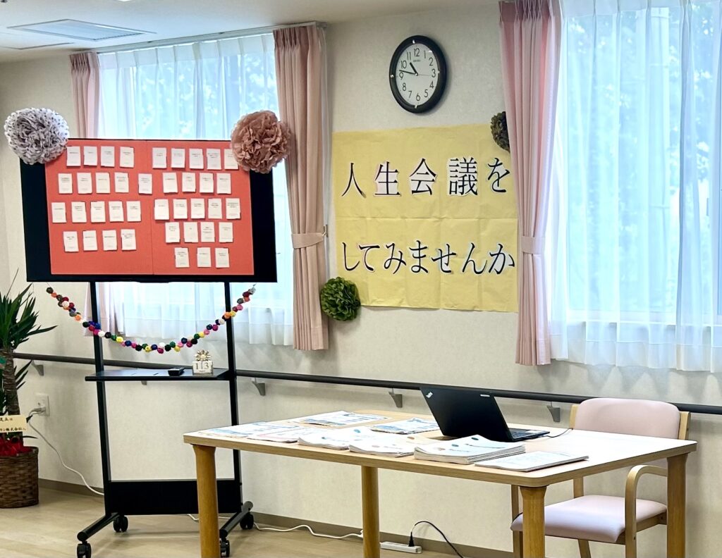 内覧会でのコーナー設置は2施設目になる。同社は独自に、入居者自身の理解を深めるツールや医療処置の説明書を用いている。癌末期の入居者の平均入居期間は3~4ヵ月で病状も変化しやすいことから、1週間に1回はACPを行うことを目標としていると、紹介コーナーの看護師